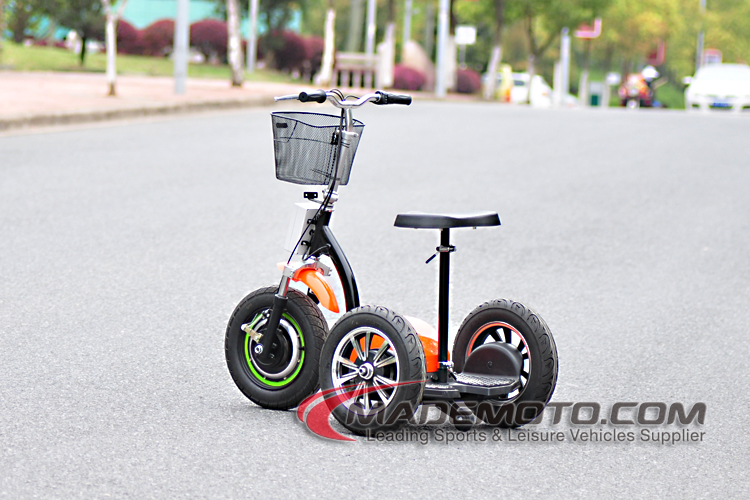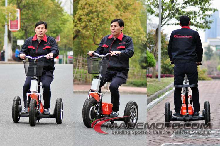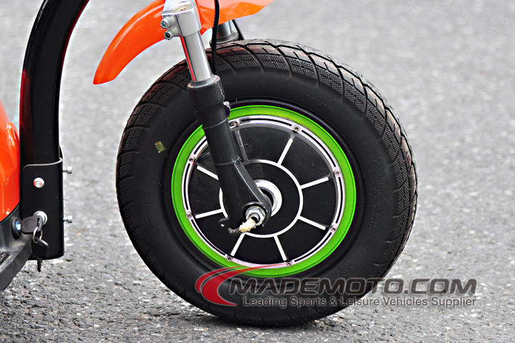We have some electric scooters with 3 wheels already. But this time, we install big 16 inch wheels on the rear. Big wheels improve riding confort, and passing ability. 350W and 500W motor are optional on this model.